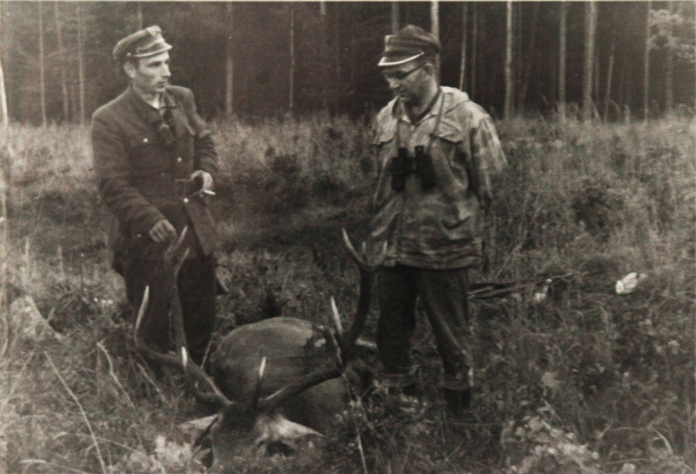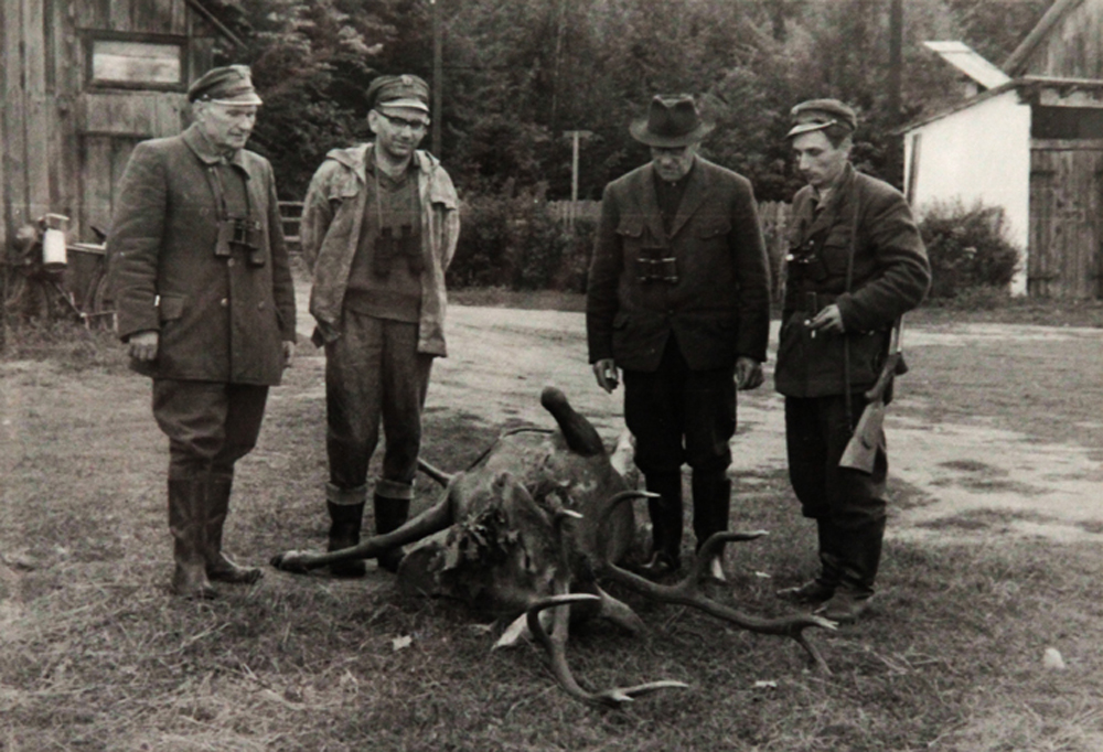 Łowczy Puszczy Lech Miłkowski w towarzystwie leśniczych łowieckich i myśliwych, z upolowanym bykiem.