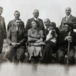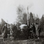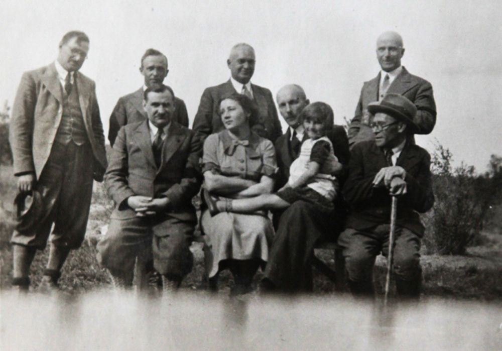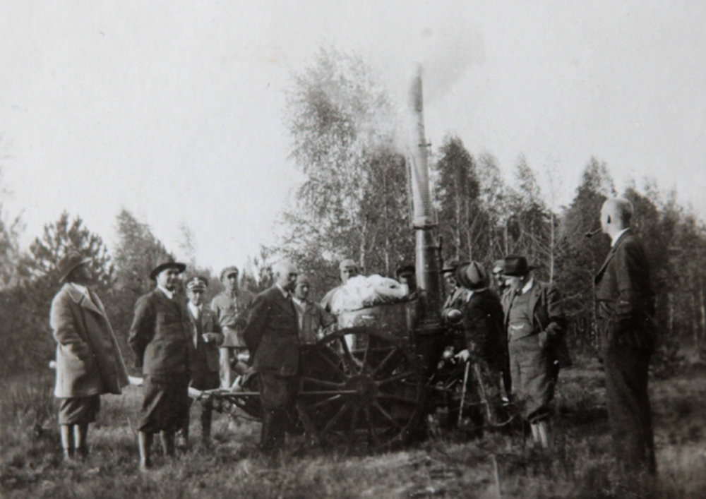 Towarzystwo oglądające maszynę służącą do chemicznych zabiegów ochrony lasu. Prawdopodobnie jest to oprysikwacz-opylacz ciągnięty przez zaprzęg konny, a przeznaczony do zabiegów w koronach drzew. Wśród zgromadzonych – przedwojenny dyrektor DLP w Białowieży – Karol Nejman oraz Jan Jerzy Karpiński – dyrektor Parku Narodowego w Białowieży.