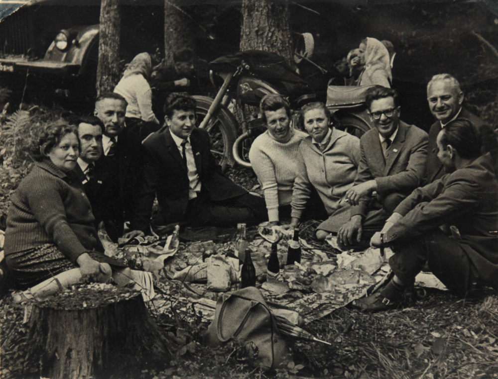 Piknik w Puszczy Trzeci od prawej – Władysław Kościewicz Źródło / Wydawca: z archiwum domowego Władysława Kościewicza Świadek: Władysław Kościewicz Projekt: Ochrona lasów i przyrody Puszczy Białowieskiej