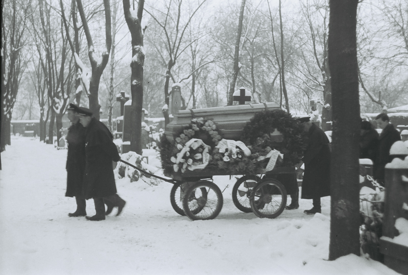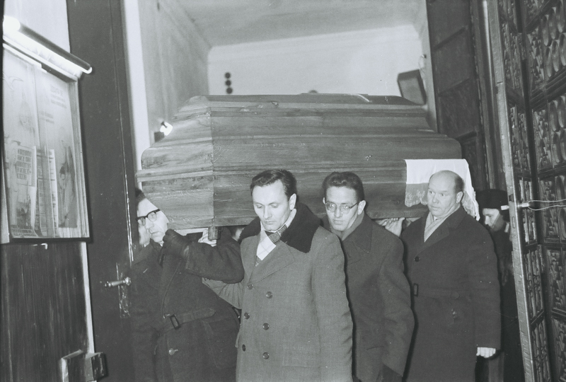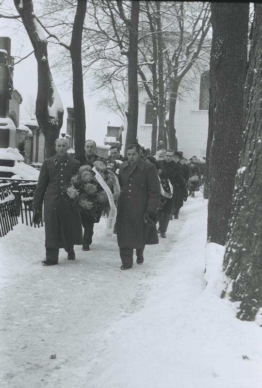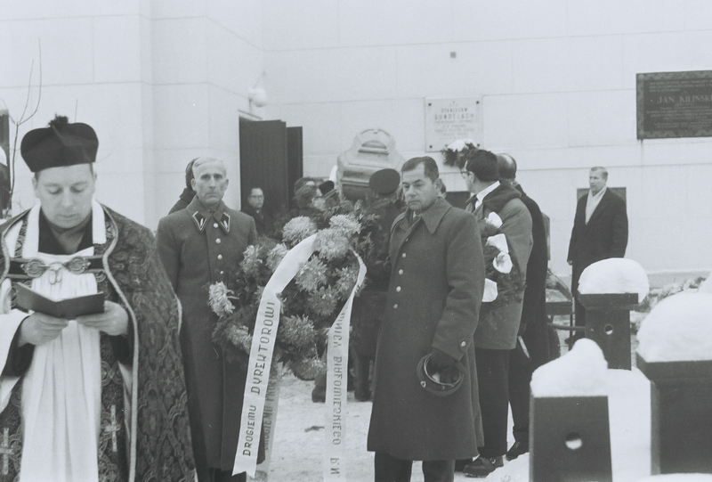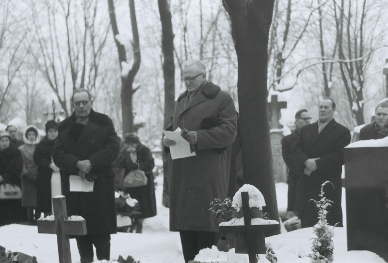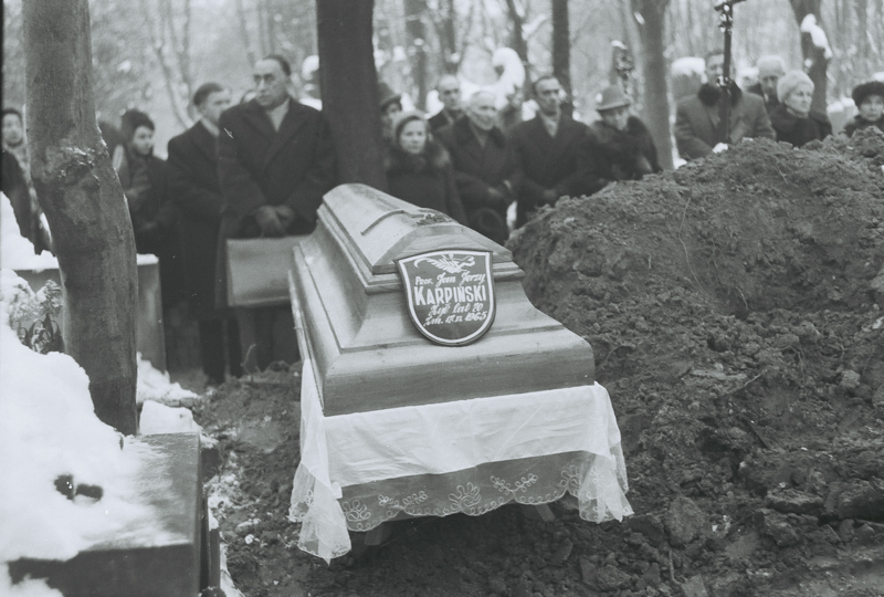Pogrzeb profesora Jana Jerzego Karpińskiego na warszawskich Powązkach. Z wieńcem przed kościołem delegacja Białowieskiego Parku Narodowego – z lewej Trofim Damianiuk, z prawej – Piotr Pilucik (strażnik z OHŻ). Nad grobem przemawia Tadeusz Molenda – podsekretarz stanu w MLiPD. Trumnę niosą – Stanisław Dunikowski, Tytus Karlikowski, Wiktor Brodzikowski – 19 listopada 1965 roku.