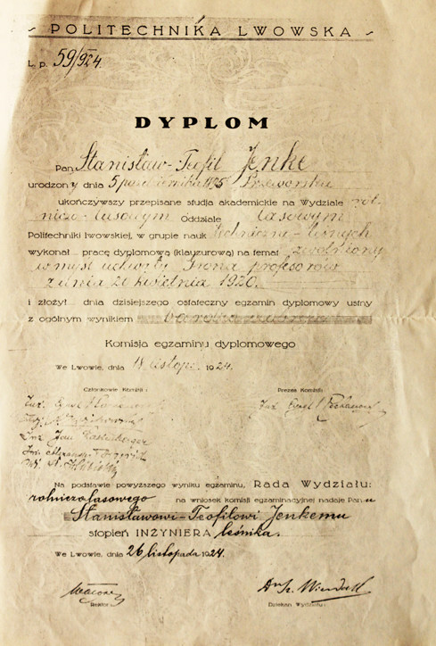 Dyplom ukończeniu Wydziału Lasowego Politechniki Lwowskiej przez Stanisława Jenke, późniejszego zastępcę dyrektora DLP w Białowieży.
